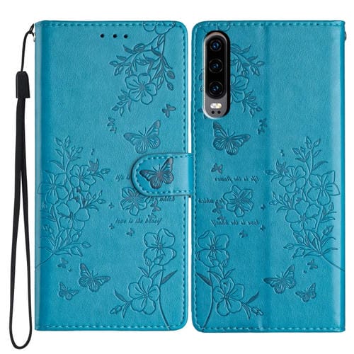 Funda de Cuero para Huawei P30 con Relieve de Flor, Amor y Mariposa (Azul)