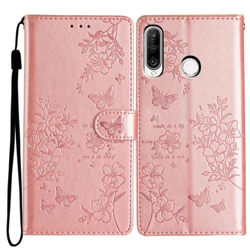 Funda para Huawei P30 Lite de Cuero con Relieve Flor de Amor y Mariposa (Oro Rosa)