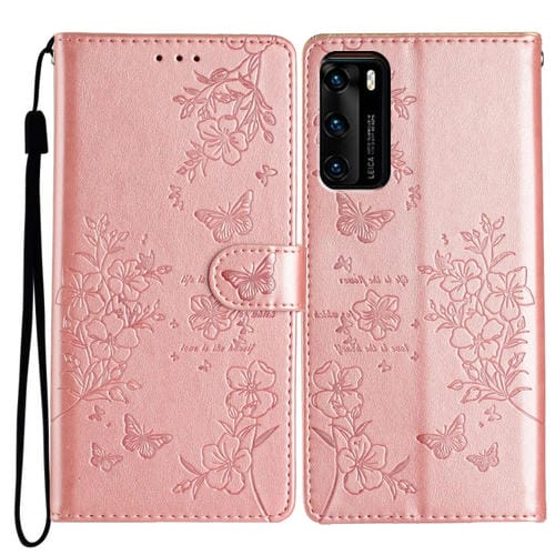 Funda de Cuero para Huawei P40 con Relieve de Flor de Amor y Mariposa (Oro Rosa)
