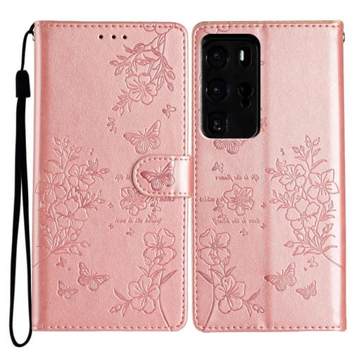 Funda de Cuero para Huawei P40 Pro Butterfly Love Flower en Relieve (Oro Rosa)