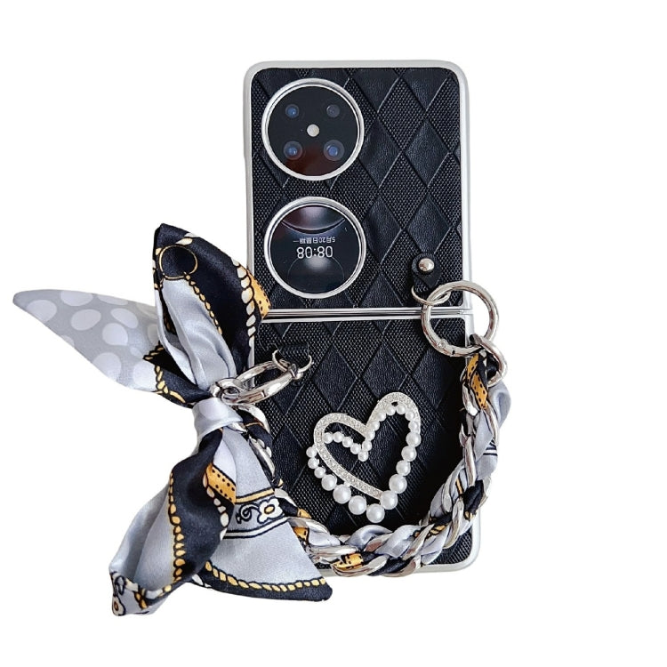Funda para Huawei P50 Pocket con Textura de Cuero Rhombus y Pulsera Corazón a Prueba de Golpes (Negro)