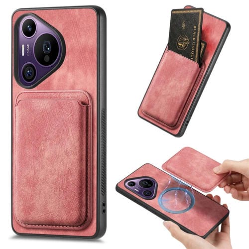 Funda para Huawei Pura 70 Pro magnética con bolsa de tarjeta de Cuero retro (Rosa)