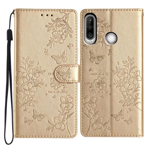 • 1x Funda de Cuero para Huawei Y6P Butterfly Love Flower en Relieve (Dorado)