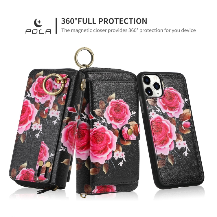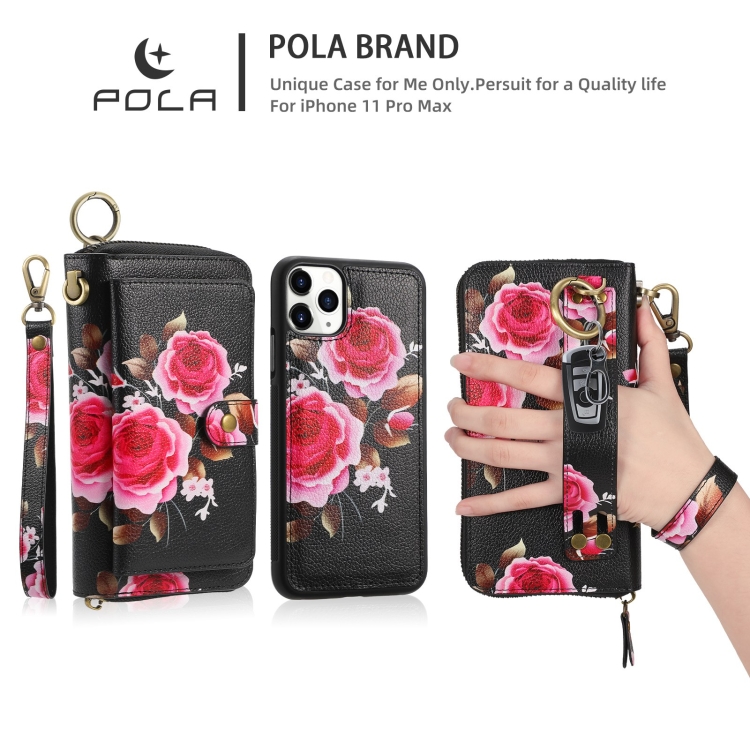 Funda para iPhone 11 Pro Pola Flower Cuero con Billetera y Cremallera Multifuncional (Negro)
