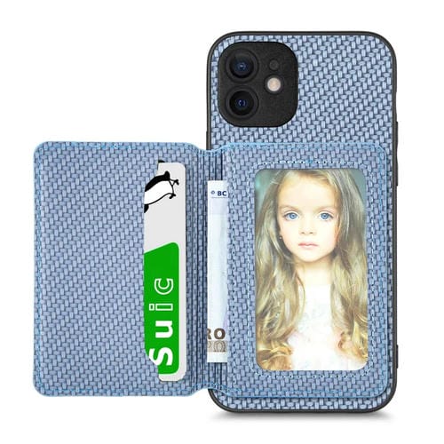 Caja de teléfono para iPhone 12 Mini con bolsa de tarjeta magnética de fibra de carbono (Azul)