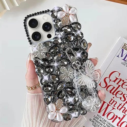 Funda para Teléfono iPhone 12 Pro con Incrustaciones de Diamantes y Mariposas Hecha a Mano (Negro)