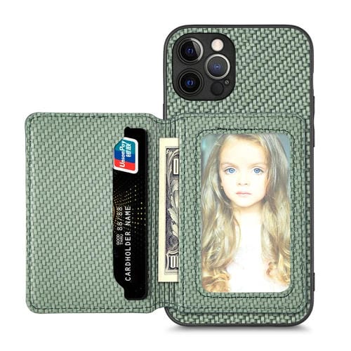 Funda de teléfono para iPhone 12 Pro Max con bolsa de tarjeta magnética de fibra de carbono (Verde)