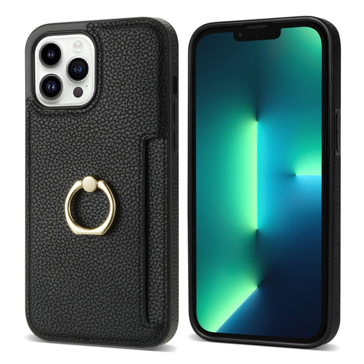 Funda Trasera para iPhone 12 Pro Max Ring Card Litchi de Cuero (Negro)
