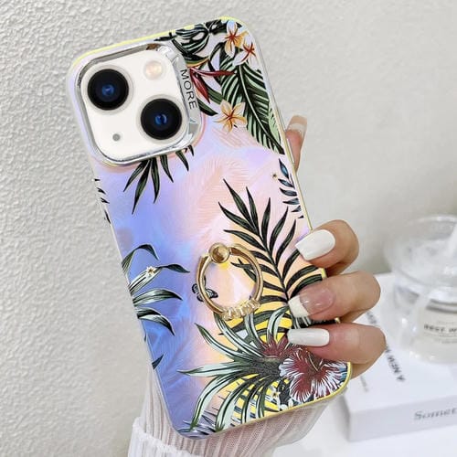 Funda de teléfono TPU para iPhone 13 con soporte de anillo y diseño de flor láser de galvanoplastia (Hojas Ah12)
