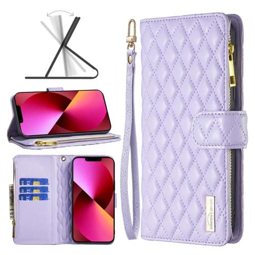 Funda para iPhone 13 Diamond Lattice Zipper Wallet Funda de Cuero con Tapa para Teléfono (Púrpura)
