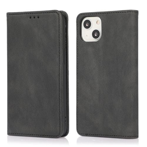 Funda de Cuero para iPhone 13 con Tapa Horizontal Textura Caballo Loco Magnético Soporte Ranuras Tarjetas Billetera (Negro)