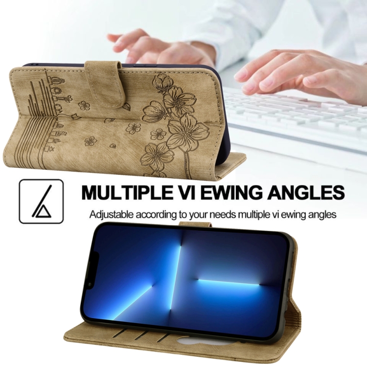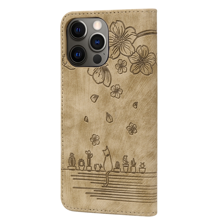 Estuche para iPhone 13 Pro Cartoon Sakura Cat de Cuero en Relieve (Marrón)