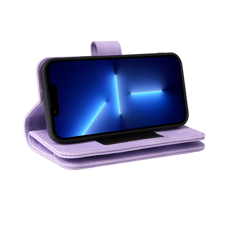 Funda de Cuero para iPhone 13 Pro Ranura para Tarjeta Multifuncional Cremallera Cartera Flip (Púrpura)