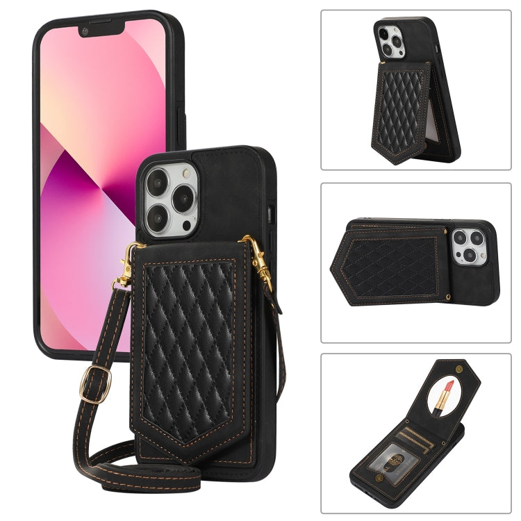 Funda para iPhone 13 Pro Rhombic Texture Rfid con Cordón y Espejo (Negro)