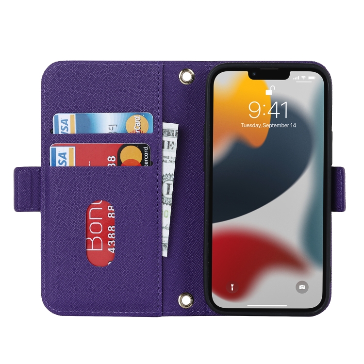 Funda para iPhone 14 Cross Texture Lanyard Leather Phone Case (Púrpura)