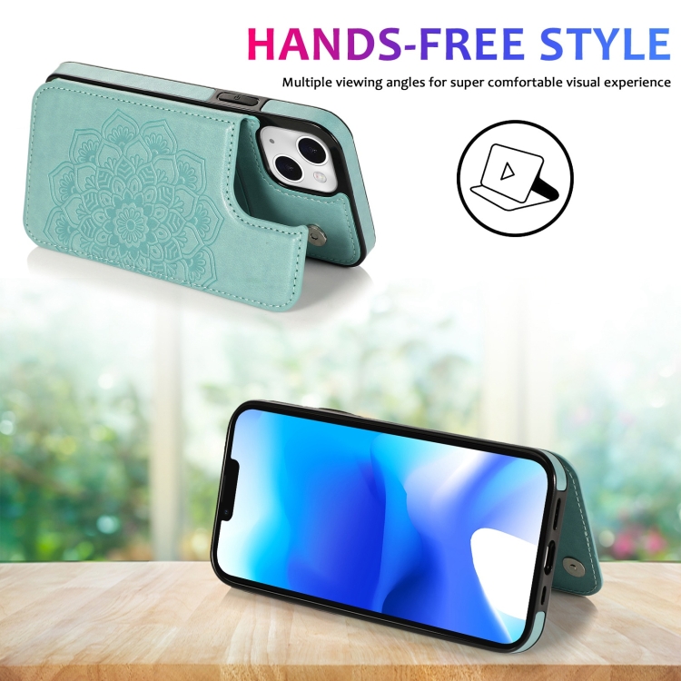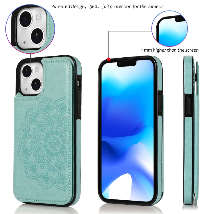 Funda para iPhone 14 Doble Hebilla Mandala Cuero con Tapa Trasera (Verde)
