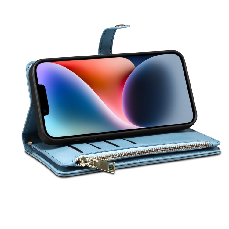 Funda de Cuero Eseble Star Series para iPhone 14 Lanyard Zipper Wallet RFID (Azul)