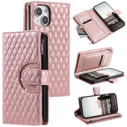 Estuche para Teléfono iPhone 14 Cuero con Billetera Cremallera Celosía Purpurina (Oro Rosa)