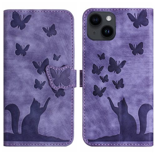 Funda para Teléfono iPhone 14 Cuero con Tapa Estampado de Gato Mariposa (Púrpura)