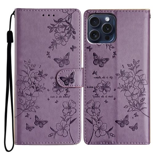 Funda de Cuero iPhone 14 Pro Max Butterfly Love Flower En Relieve (Púrpura)