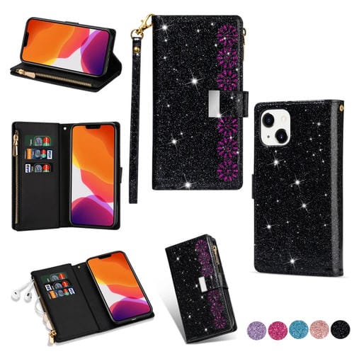 Estuche de Cuero para iPhone 14 Ranuras para Tarjetas Múltiples con Cremallera y Brillo Tallado con Láser (Negro)