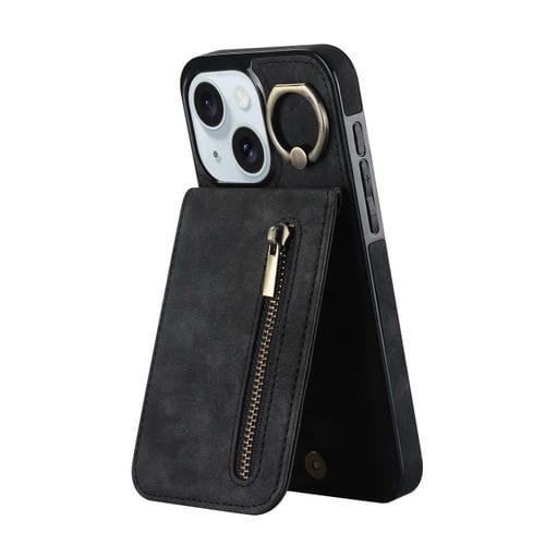 Estuche para teléfono iPhone 15 con ranura para tarjeta RFID anillo retro y cremallera (Negro)