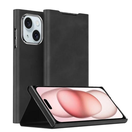 Funda magnética de cuero para iPhone 15 con textura de Napa y soporte (Negro)