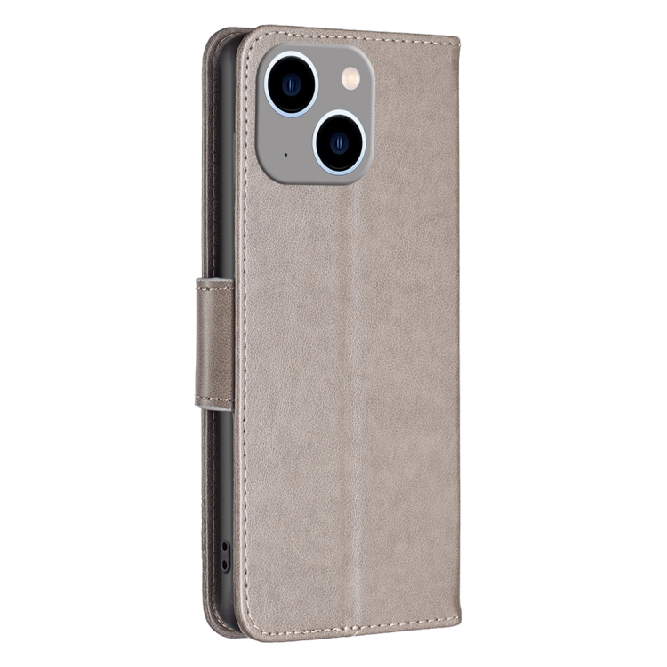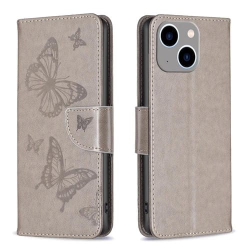 Funda de cuero para iPhone 15 Plus Estampado en relieve dos mariposas (Gris)