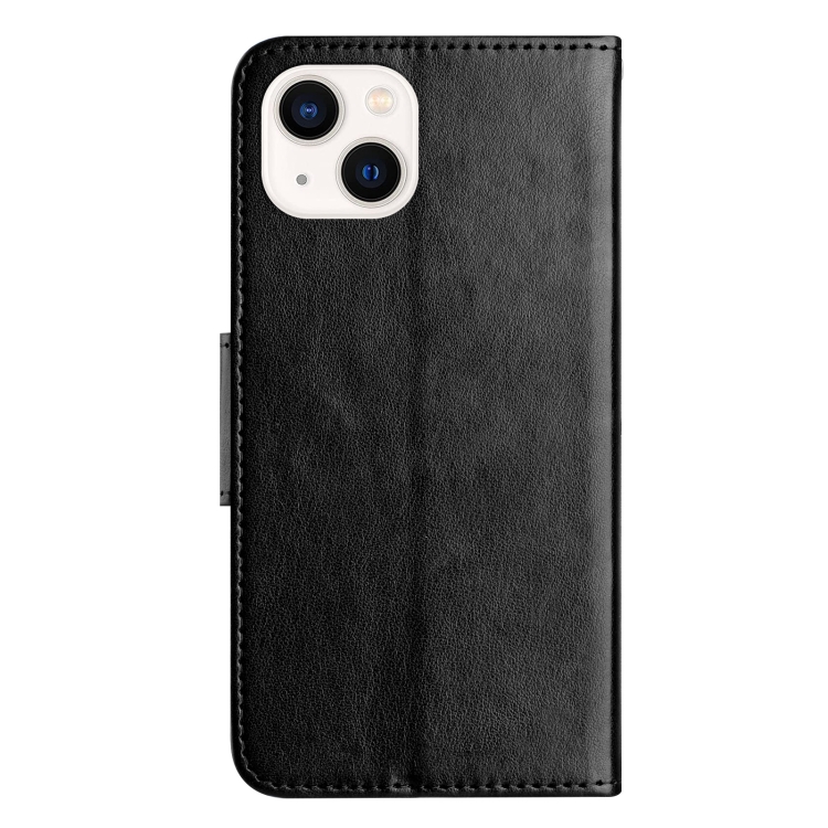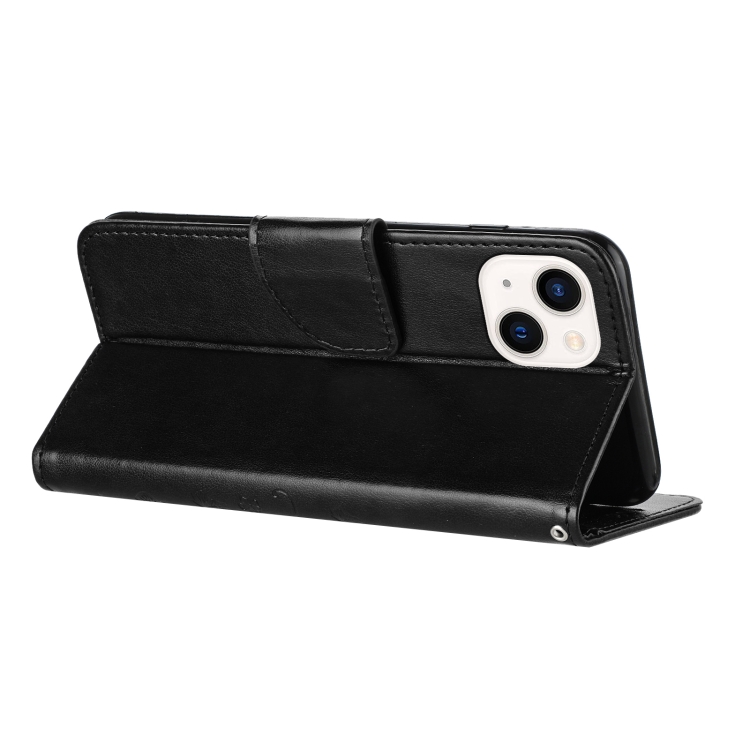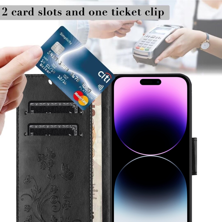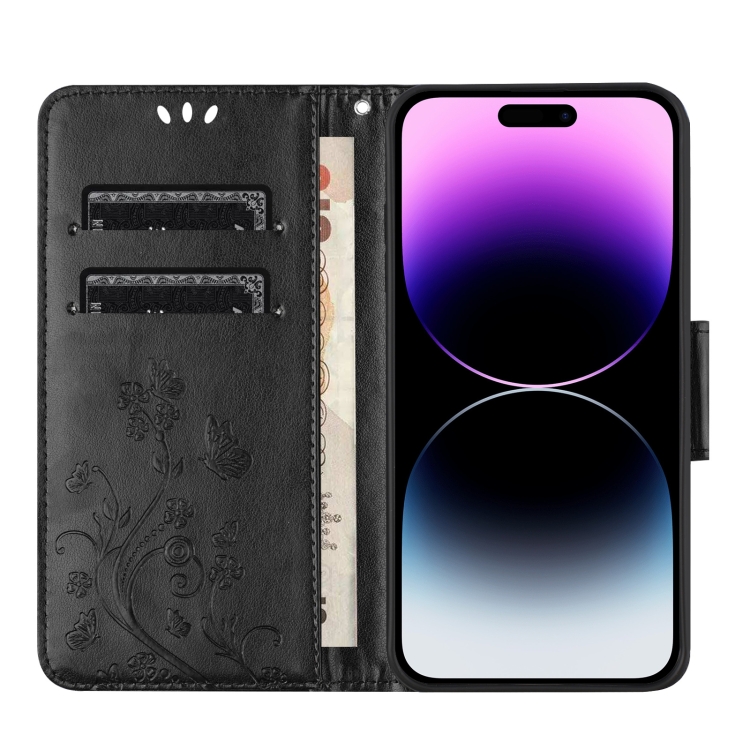 Funda de Cuero para iPhone 15 Plus con Tapa y Patrón de Flores de Mariposa (Negro)