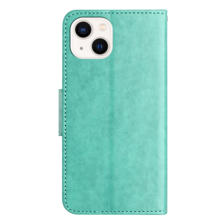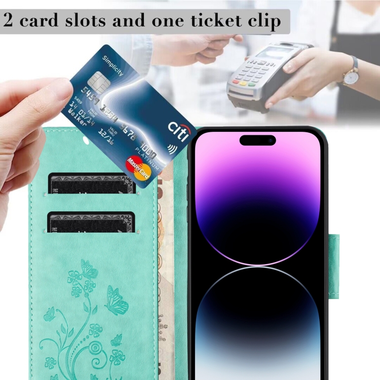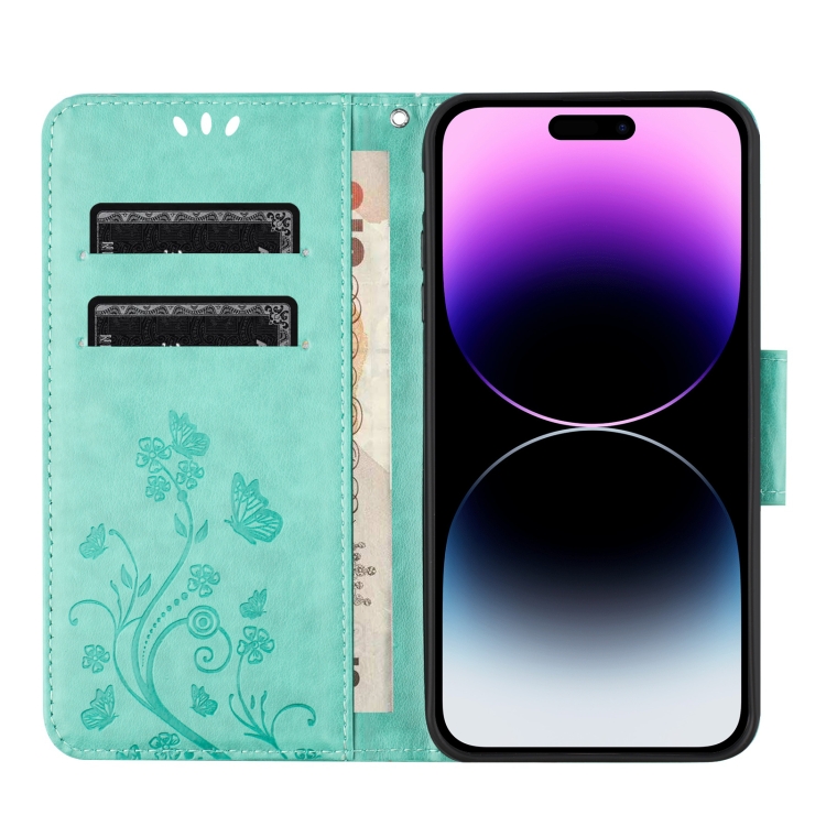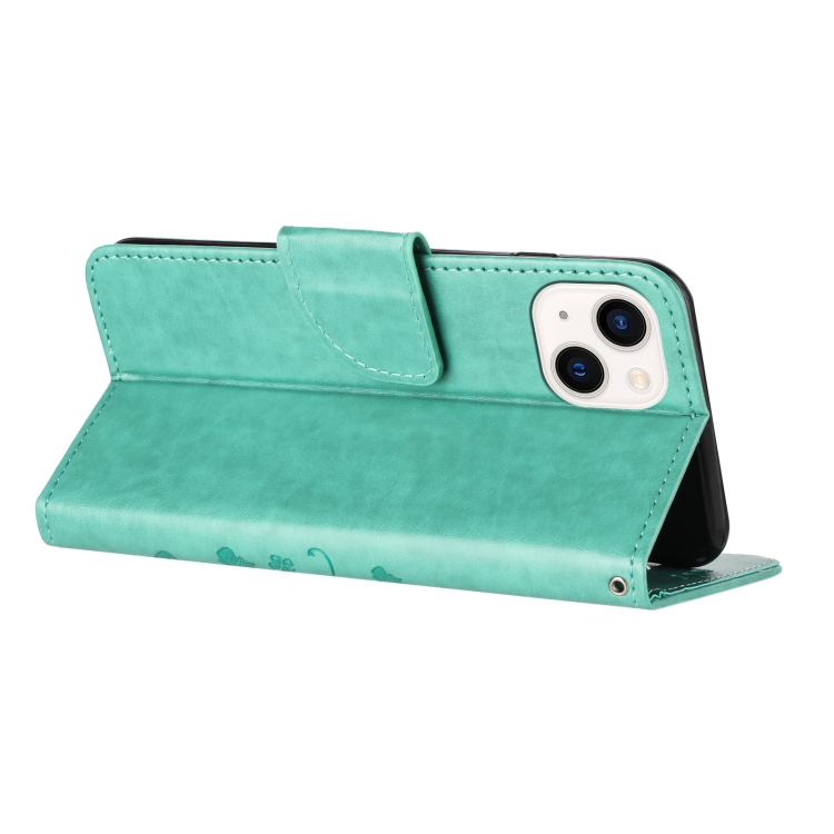 Funda para iPhone 15 Plus Cuero con Tapa y Patrón de Flores de Mariposa (Verde)