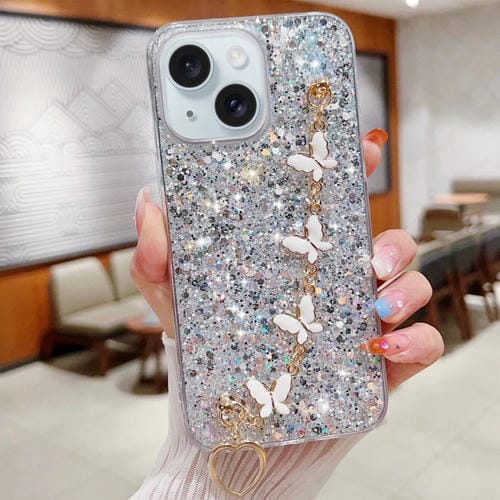 Funda para Teléfono TPU Epoxi iPhone 15 Plus con Cadena de Mariposa y Lentejuelas Estrelladas (Plateado)