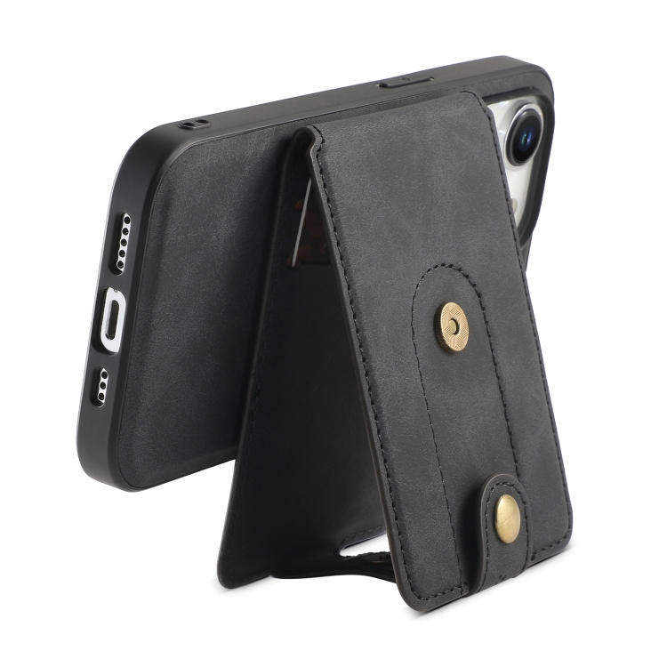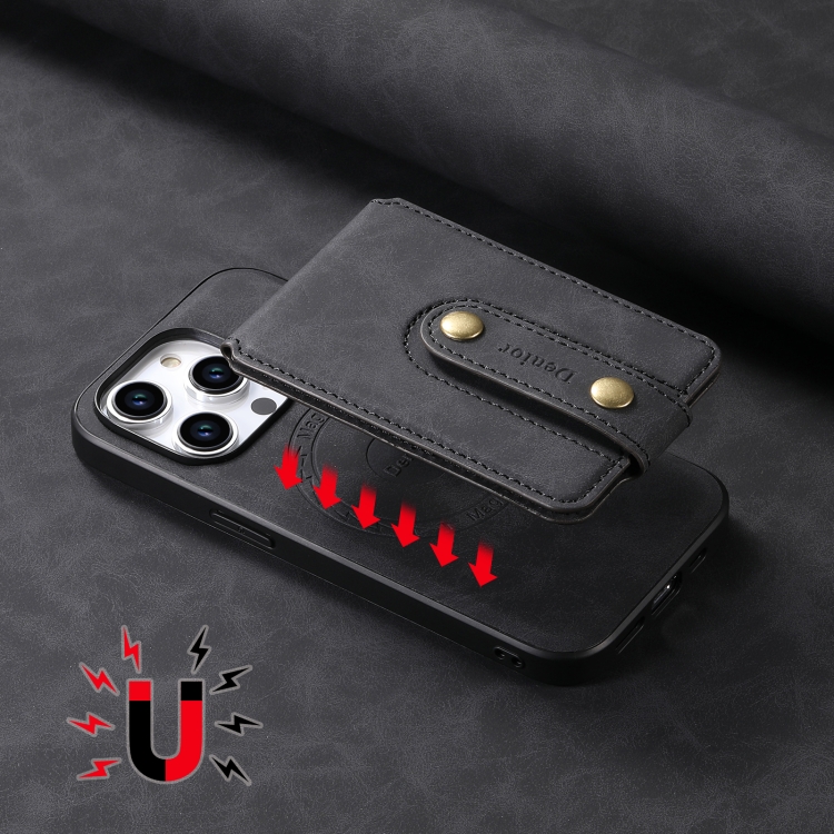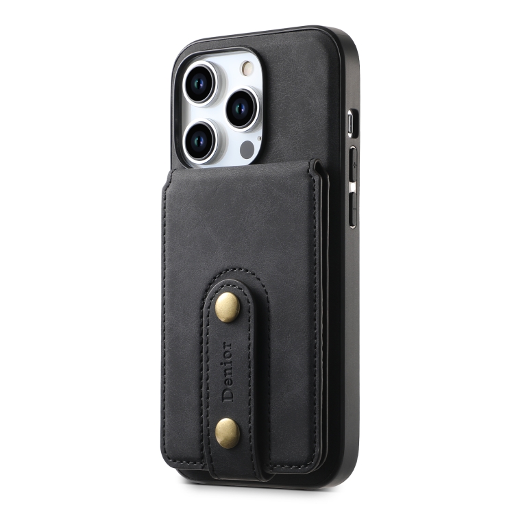 Estuche de Cuero Denior D14 Nk para iPhone 15 Pro con Tarjetero Magnético Magsafe y Patrón Retro (Negro)