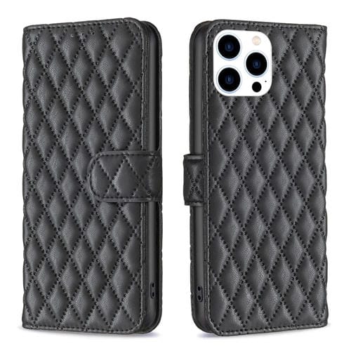 Funda para iPhone 15 Pro Diamond Lattice Wallet Flip de Cuero para Teléfono (Negro)