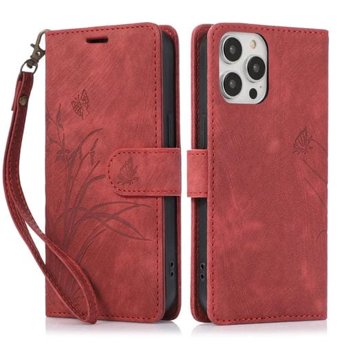 Funda para Teléfono iPhone 15 Pro Cuero Relieve Mariposa Orquídea (Rojo)