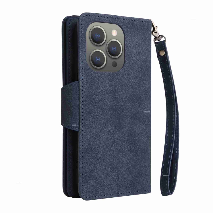 Funda de Cuero para iPhone 15 Pro con Remache Hebilla y 9 Tarjetas Tres Pliegues (Azul)