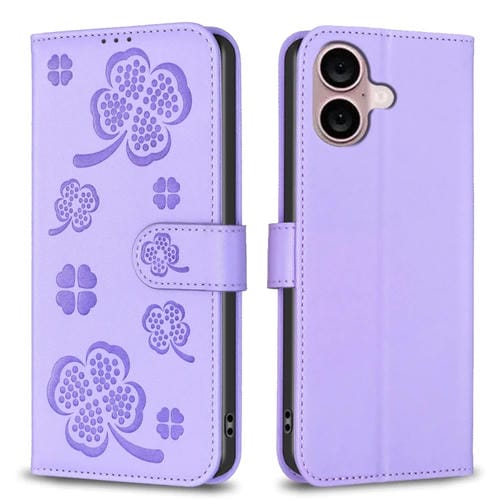 Funda para teléfono iPhone 16 Plus Cuero con relieve de cuatro hojas (Púrpura)