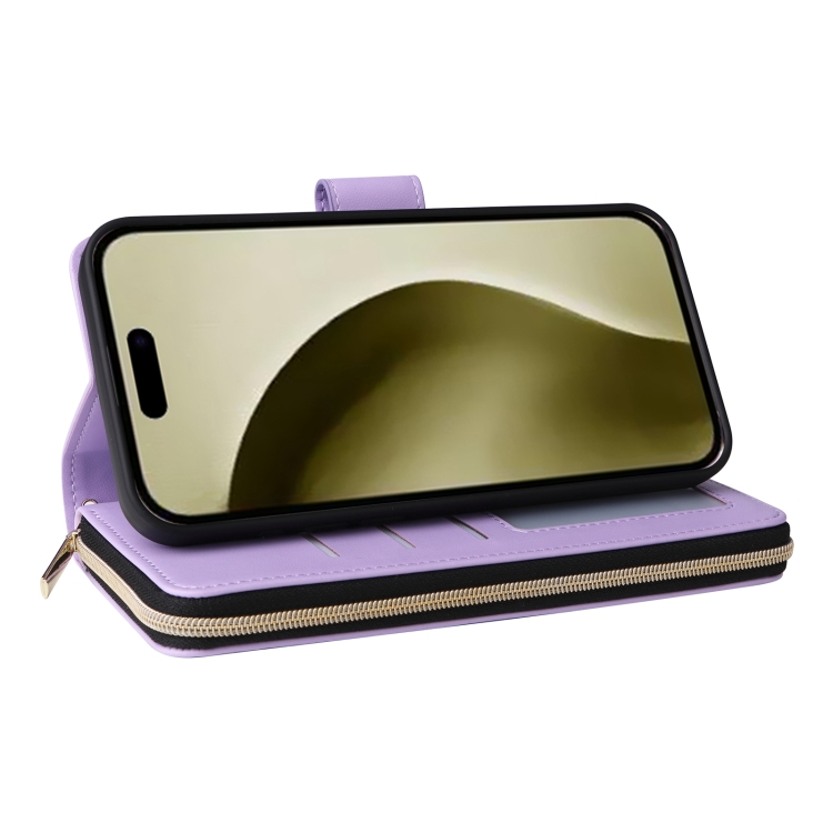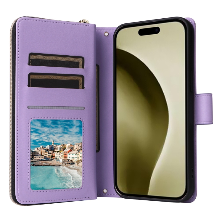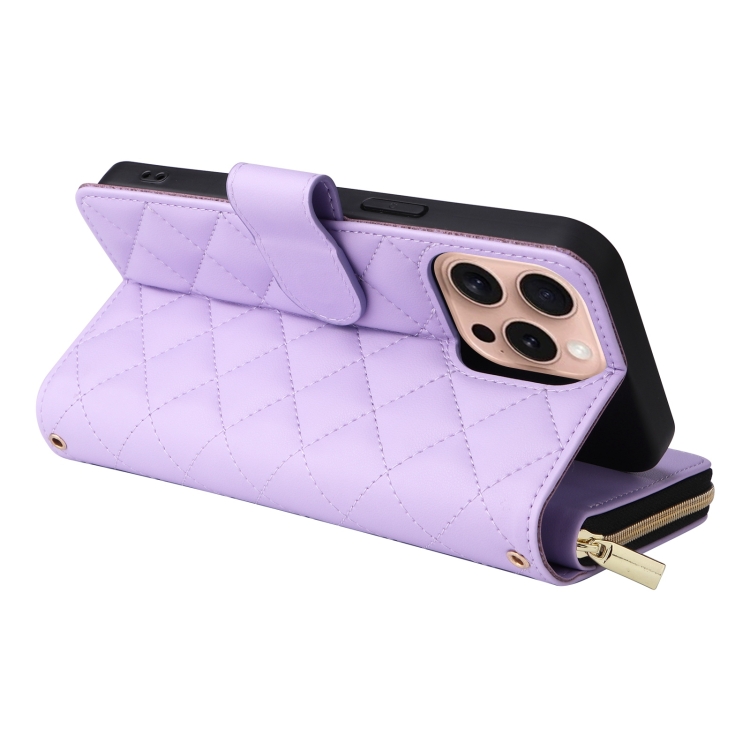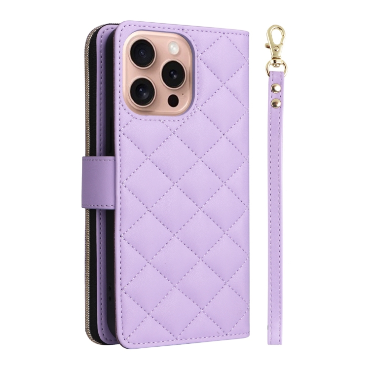 Funda para Teléfono iPhone 16 Pro Cuero Hebilla Torre Cremallera Rombal Cruzada Cordón (Púrpura)