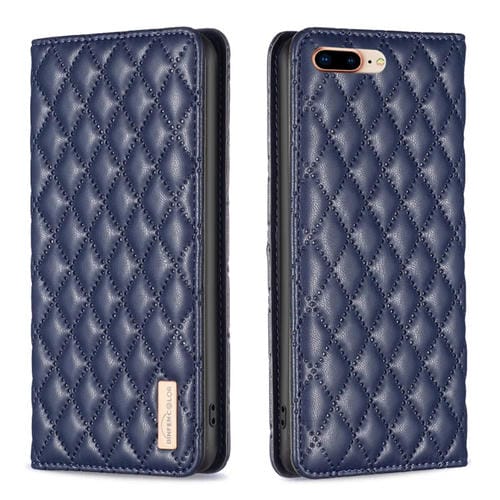 Funda de teléfono iPhone 8 Plus 7 Plus con tapa de cuero magnético Diamond Lattice (Azul)