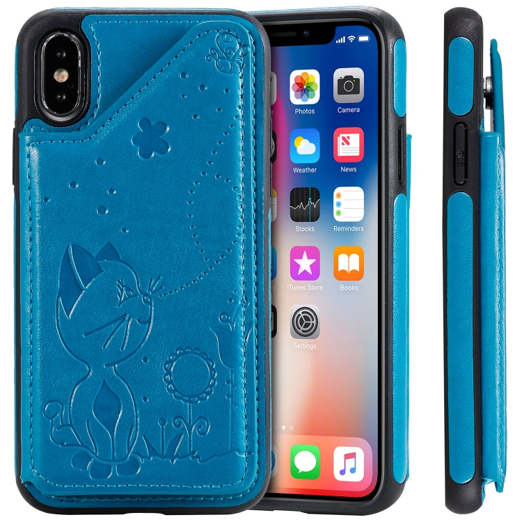 Estuche protector para iPhone X Cat Bee con patrón en relieve, a prueba de golpes, ranuras para tarjetas y marco de fotos (Azul)