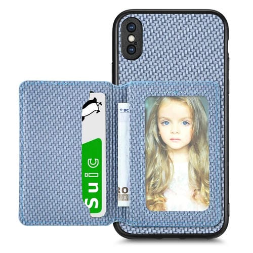 Caja de Teléfono para iPhone X Xs con Bolsa de Tarjeta Magnética Fibra de Carbono (Azul)