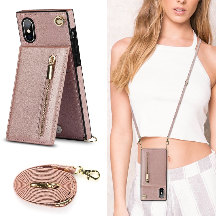 Funda Trasera Cross-Body para iPhone X Xs TPU + PU con Soporte Ranuras Tarjetas Billetera Correa (Oro Rosa)