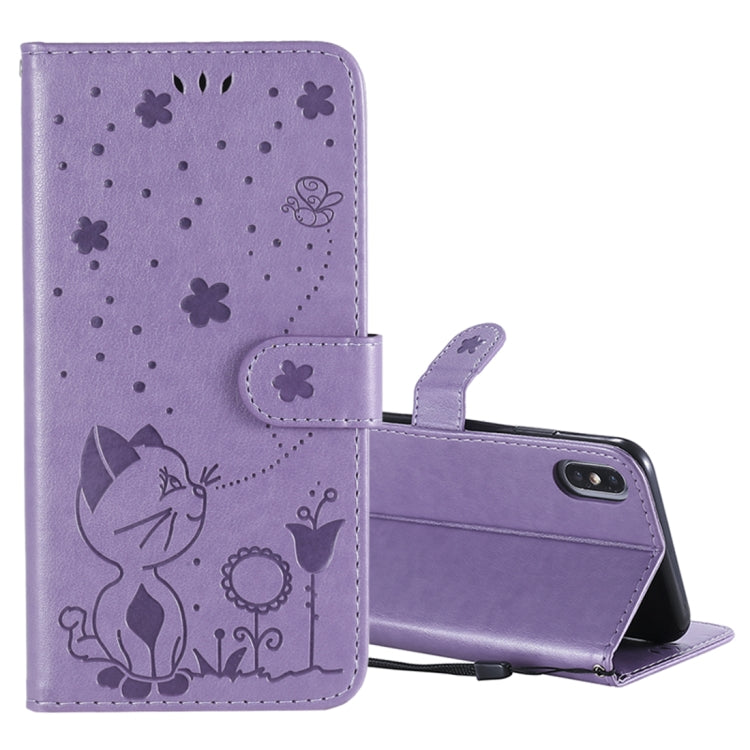 Funda de cuero iPhone Xs Max Cat Bee patrón en relieve tapa horizontal soporte y ranuras para tarjetas (Púrpura)
