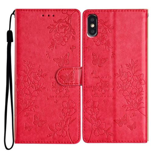 Funda para Teléfono iPhone Xs X Cuero Relieve Flor Amor y Mariposa (Rojo)