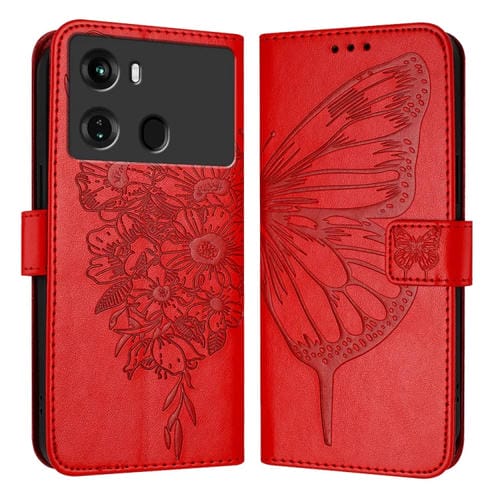 Funda de Cuero para Itel P40 con Mariposa en Relieve (Rojo)