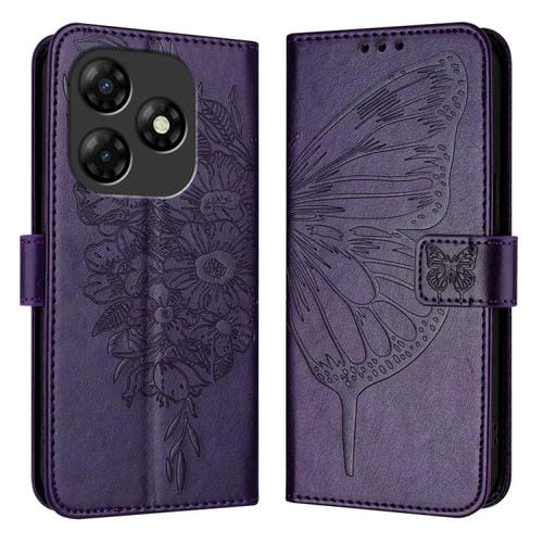 Funda de Cuero para Itel P55 4G con Mariposa en Relieve (Púrpura Oscuro)