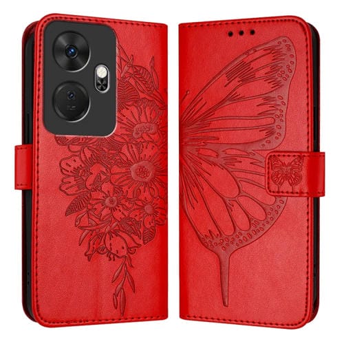 Funda de Cuero para Itel P55 con Mariposa en Relieve (Rojo)