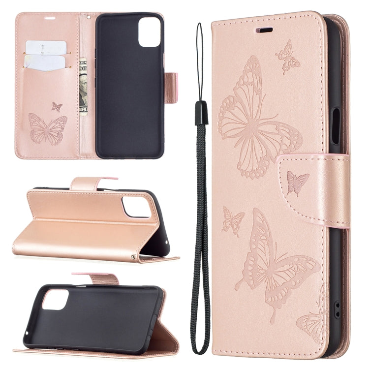 Funda de Cuero Flip para LG K42 con Estampado Dos Mariposas, Soporte, Ranura y Cordón (Oro Rosa)