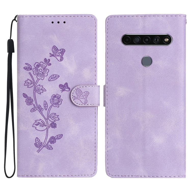Funda de Cuero para LG K51S con Flor Mariposa y Relieve Patrón (Púrpura)