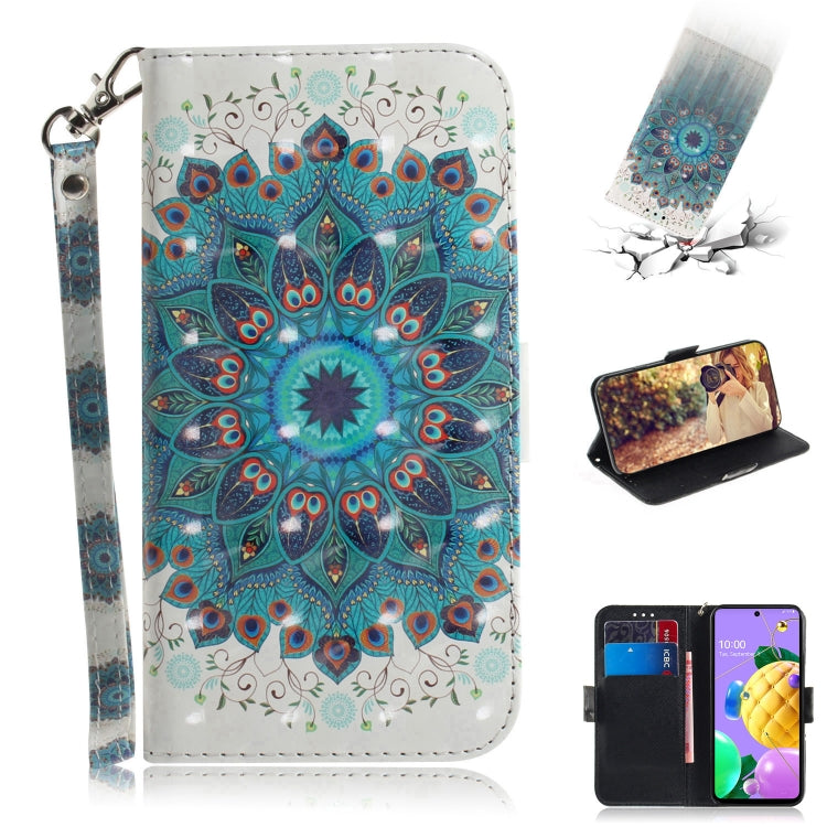 Funda de Cuero Abatible Horizontal para LG K52 con Dibujo 3D, Soporte, Ranuras, Billetera y Cordón (Corona de Pavo Real)