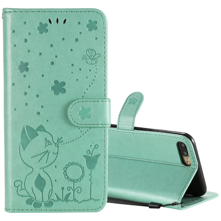 Funda para iPhone 8 Plus Patrón Gato Abeja Grabado en Relieve Cuero Tirón a Prueba de Golpes Horizontal con Ranuras y Sostenedor (Verde)